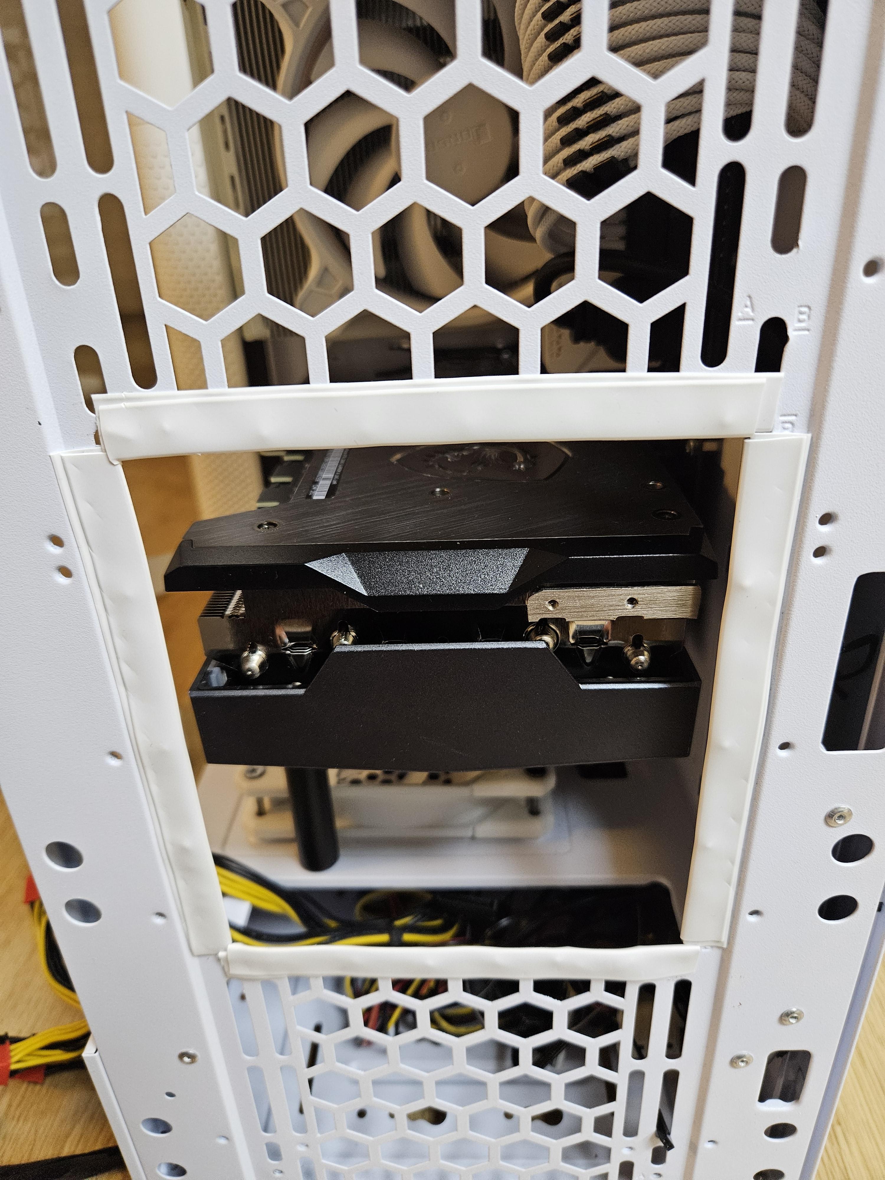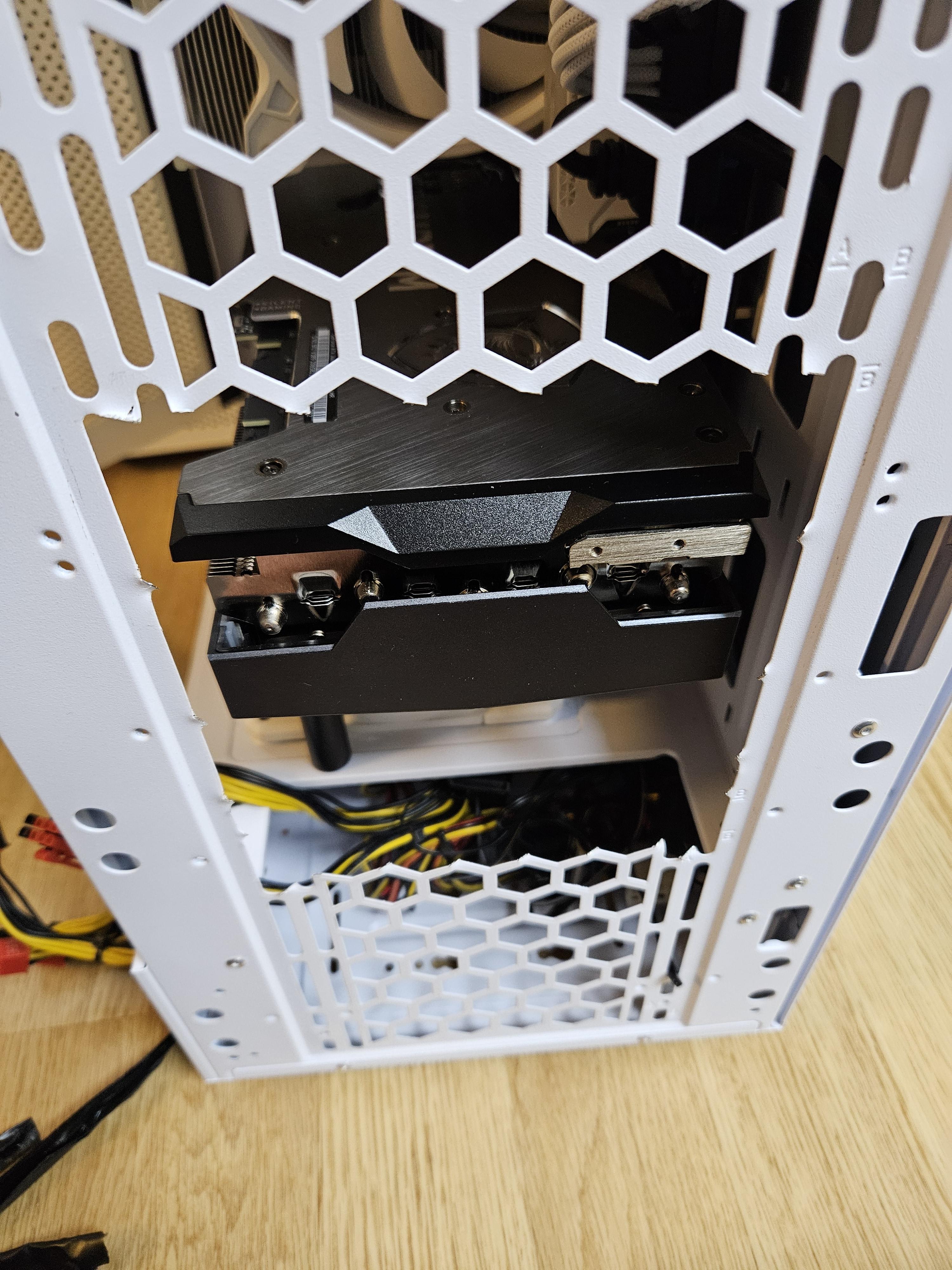 g40 는 조립된상태에서는 긴그래픽카드를 넣는게 거의 불가능했으나 잘린케이스쪽으로 그래픽카드를 기울여서 넣고 장착하였다.